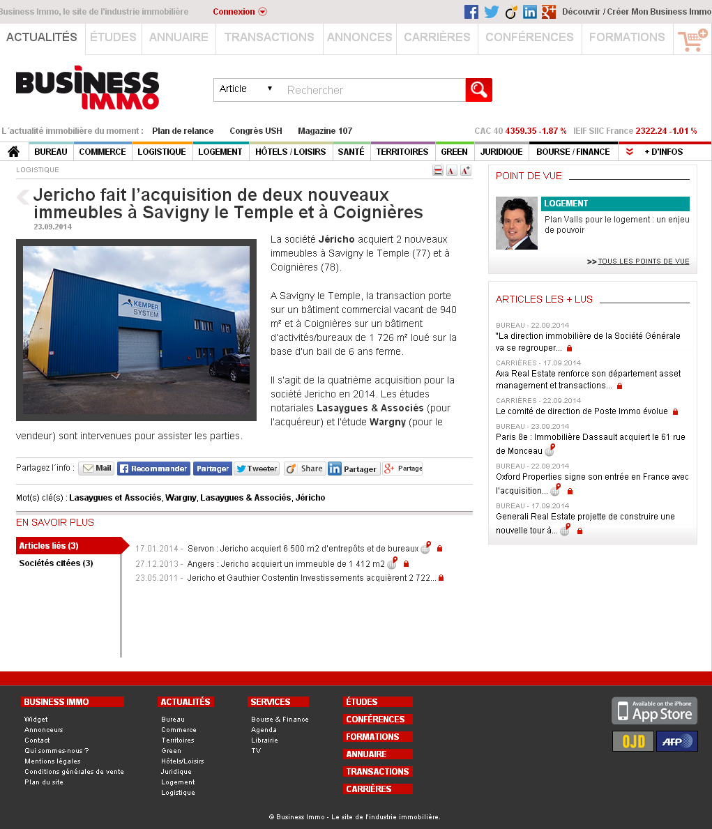 "Jericho fait l'acquisition de nouveaux immeubles à Savigny le Temple et à Coignières"